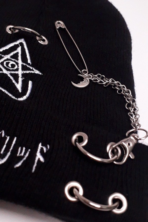 Posee una micro cadena desmontable constituida por dos caminos de cadenas con dije Moon a modo de ornamentación, apta para añadirle a cualquiera de sus argollitas & un alfiler de gancho de acero.